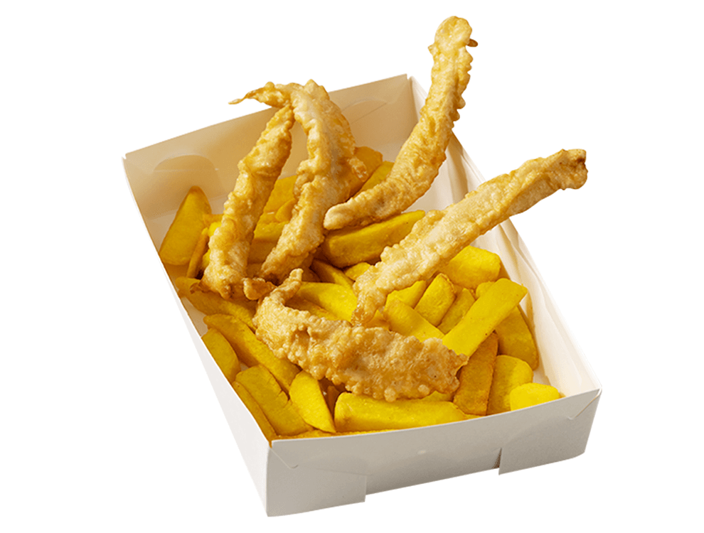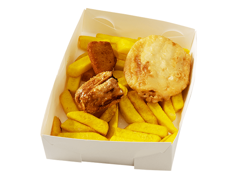 Two flake, two kids flake, four potato cakes, four dim sims and small chips