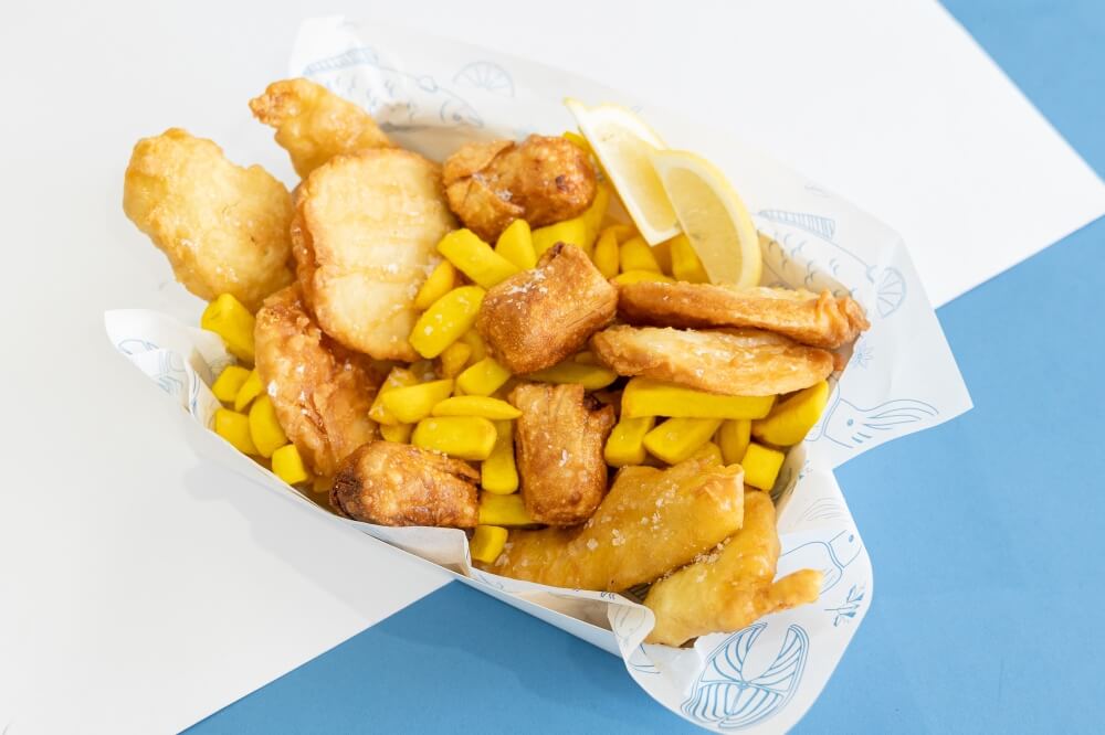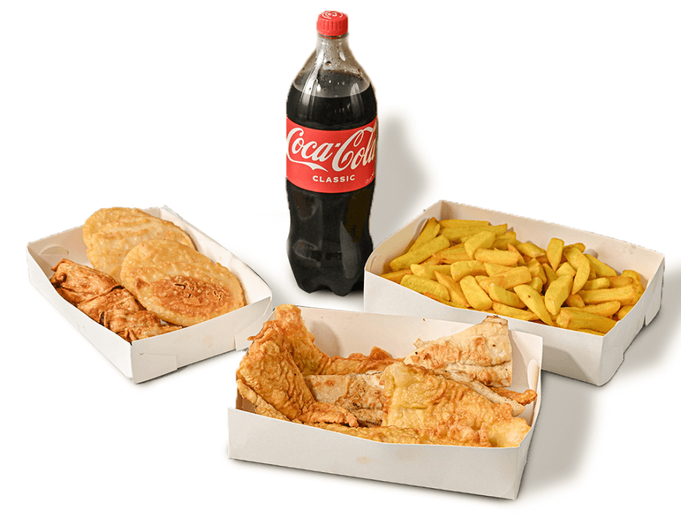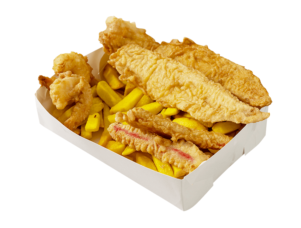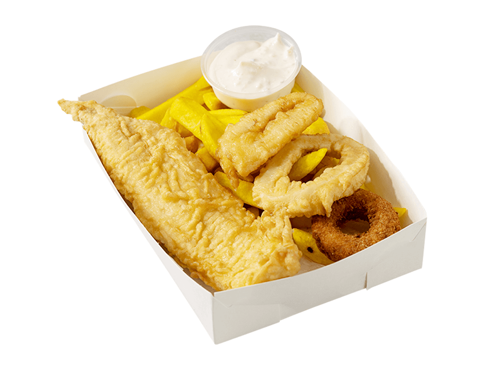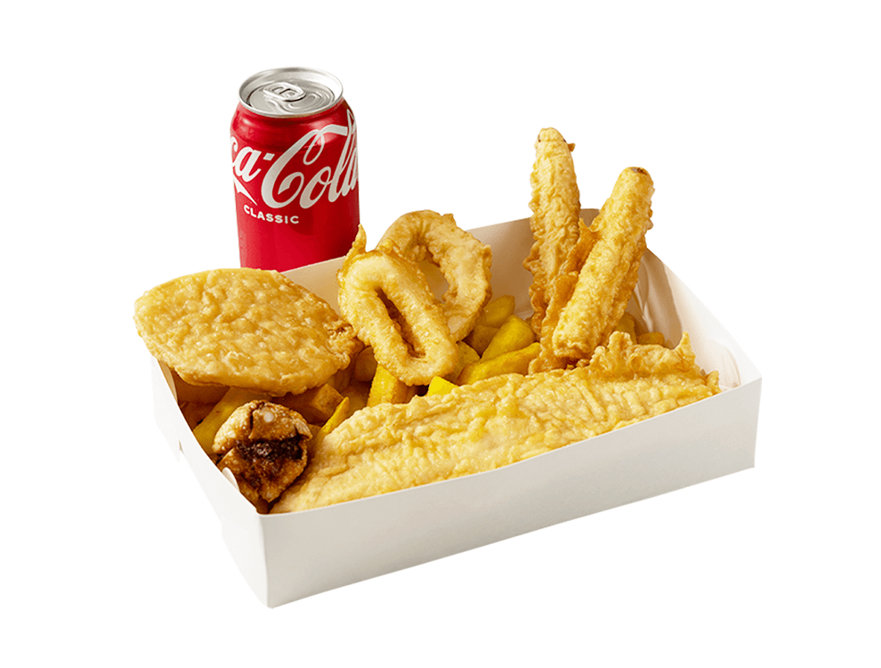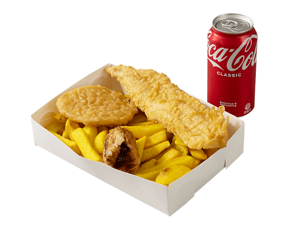 Flake, potato cake, dim sim, two battered calamari, two crab sticks, chips and a can of drink