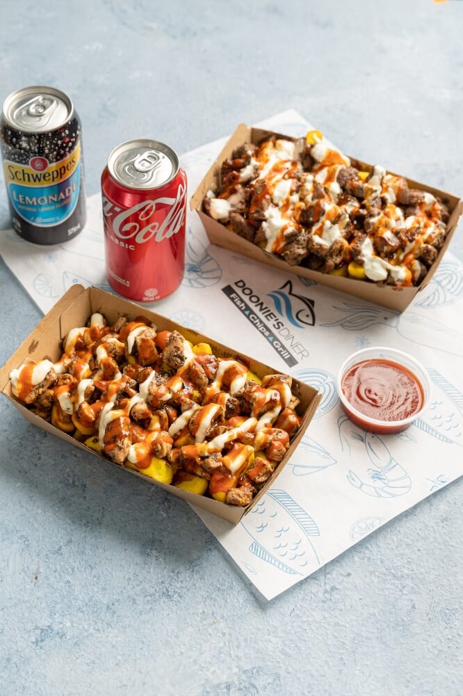 300grams of Leg Lamb or Chicken Breast, Chips, with your choice of cheese and up to three sauces.